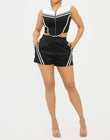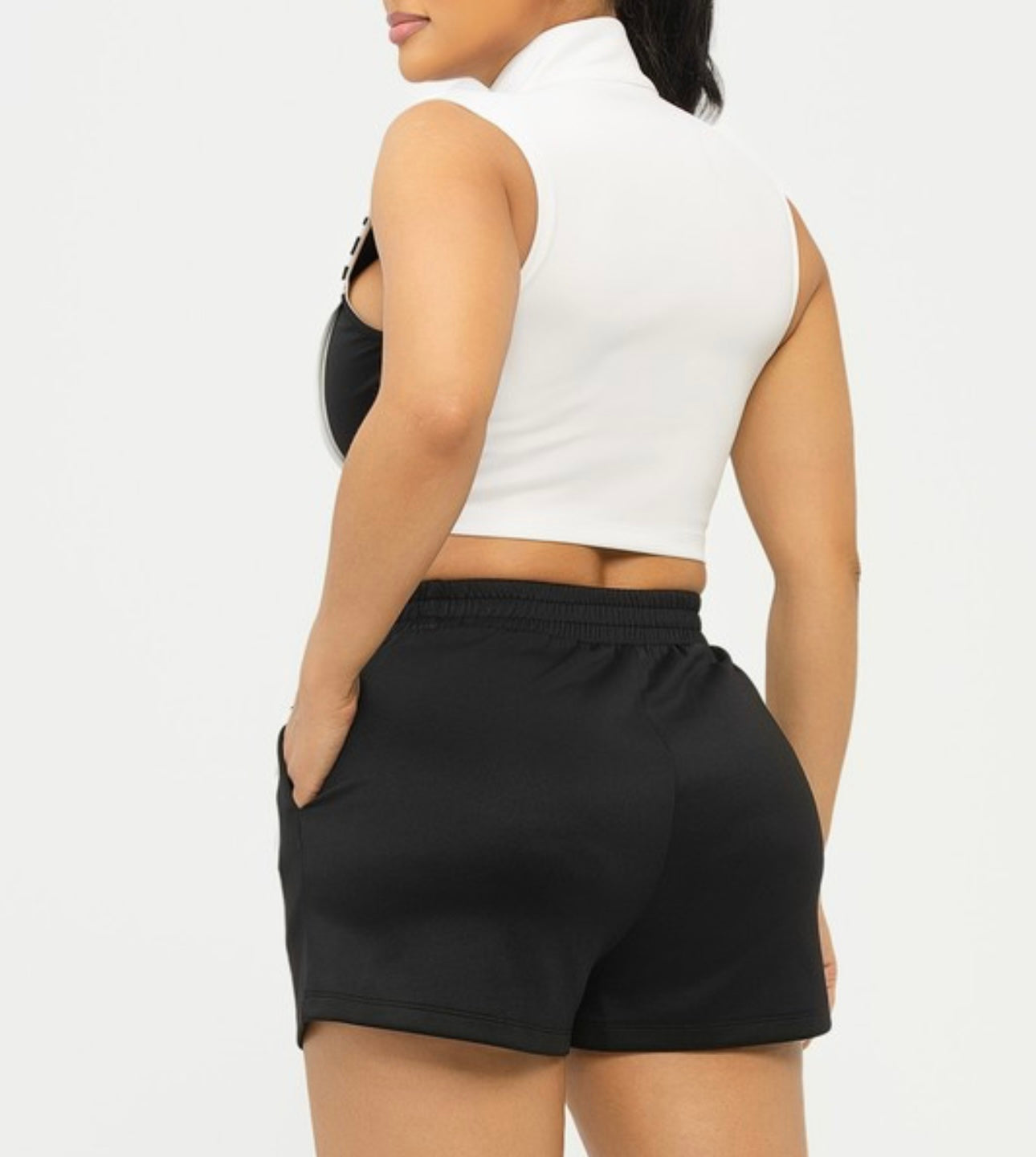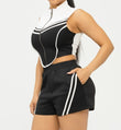 Stripe Taping Detailed Front Zipper Top & Stripe Detailed Side Pockets Elastic Waistband Sporty Loose Fitted Shorts Short Set (94% Polyester 6% Spandex, Great Stretch)