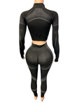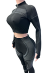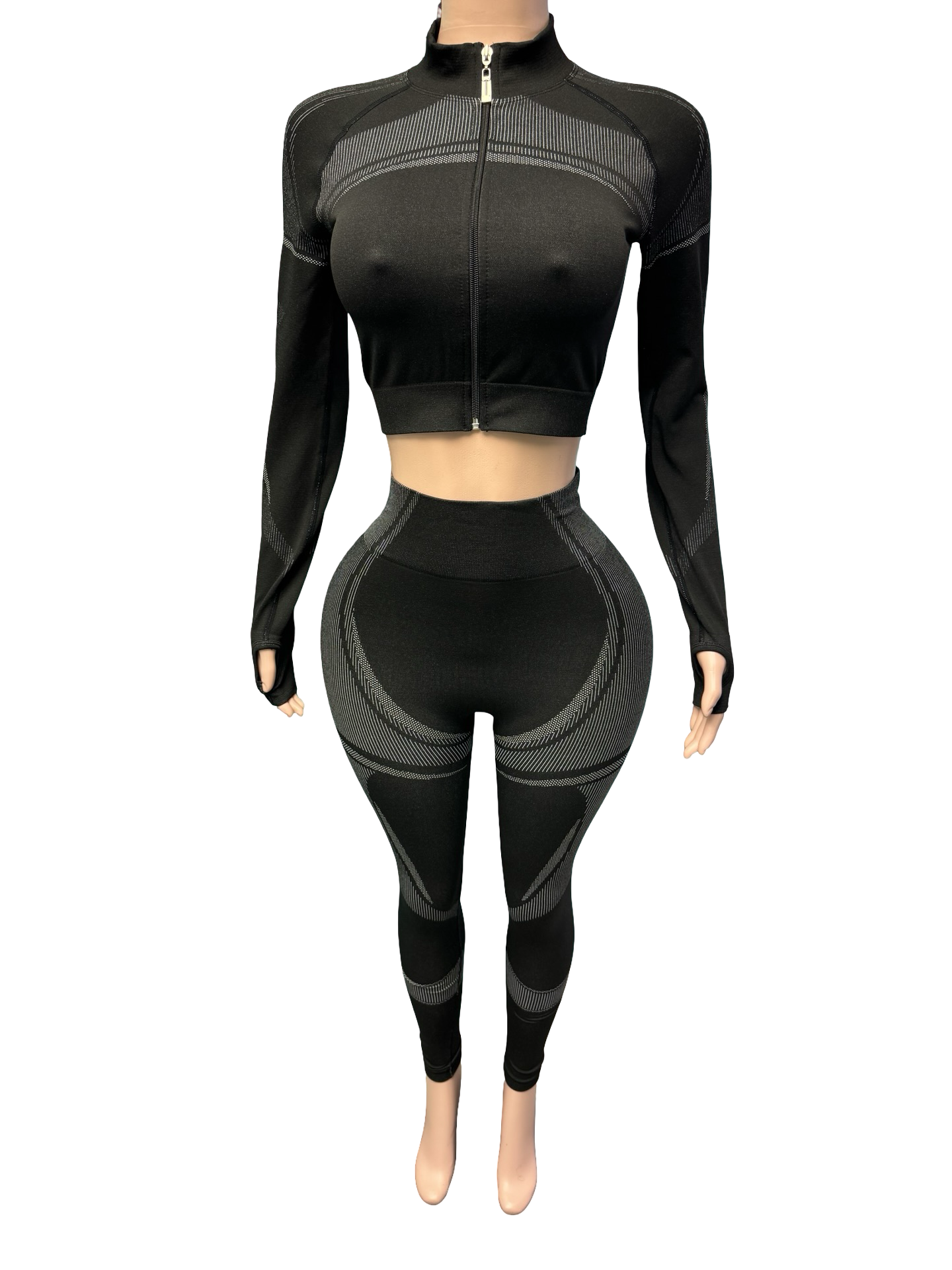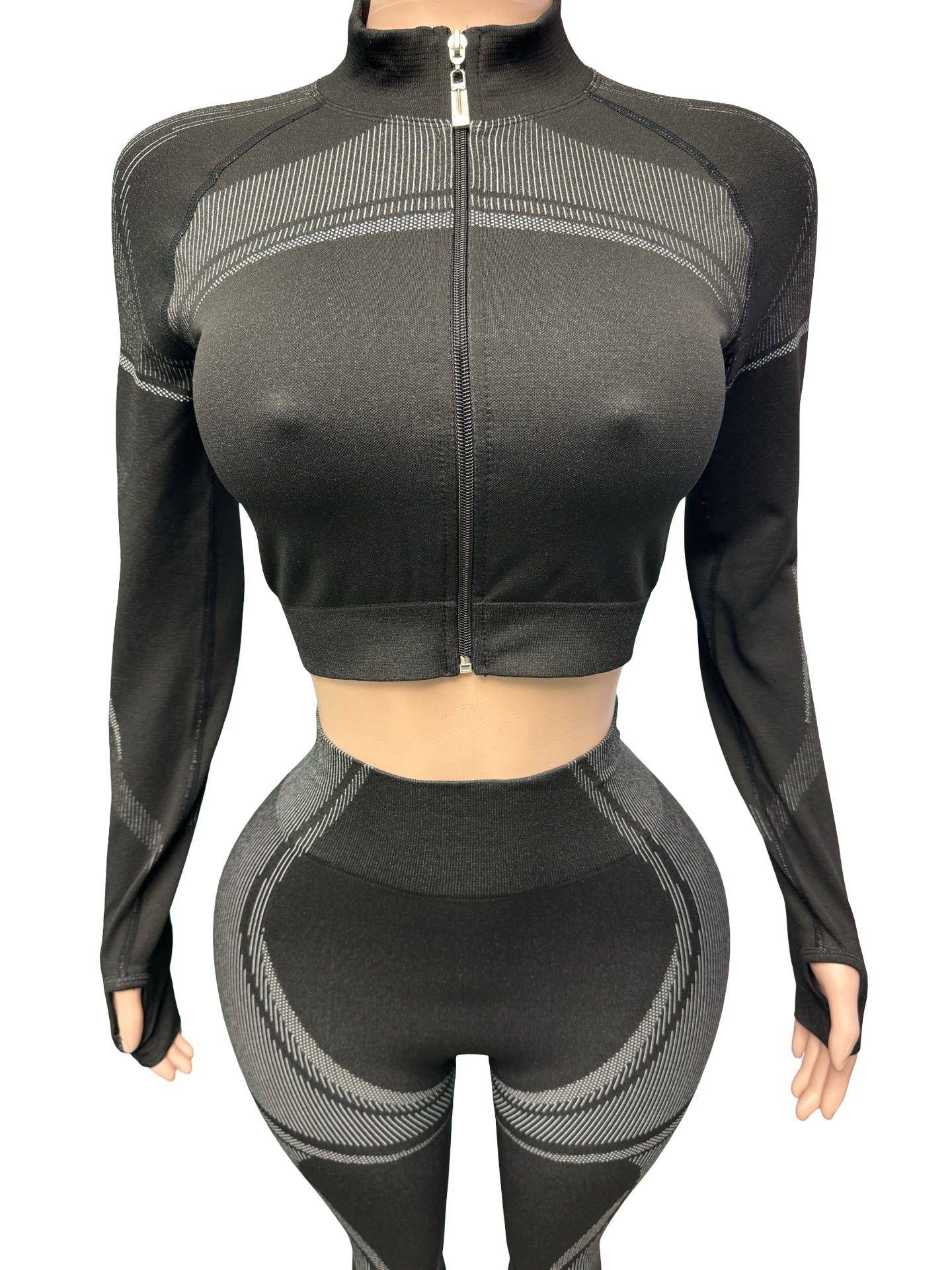 Seamless Textured Open Thumb Holes Long Sleeve Mock Neck Front Zip Up Cropped Jacket & Legging Set. (85% Nylon, 7% Polyester, 8% Spandex, Great Stretch)